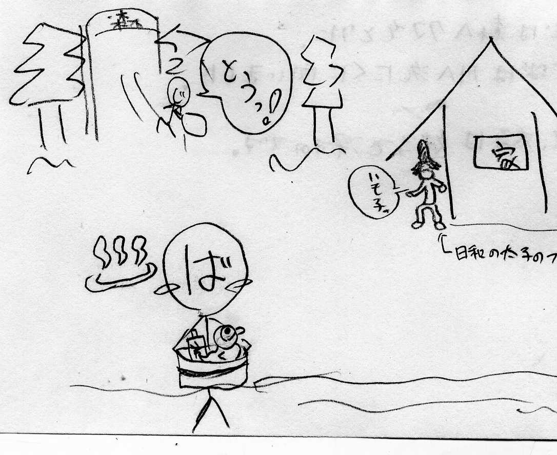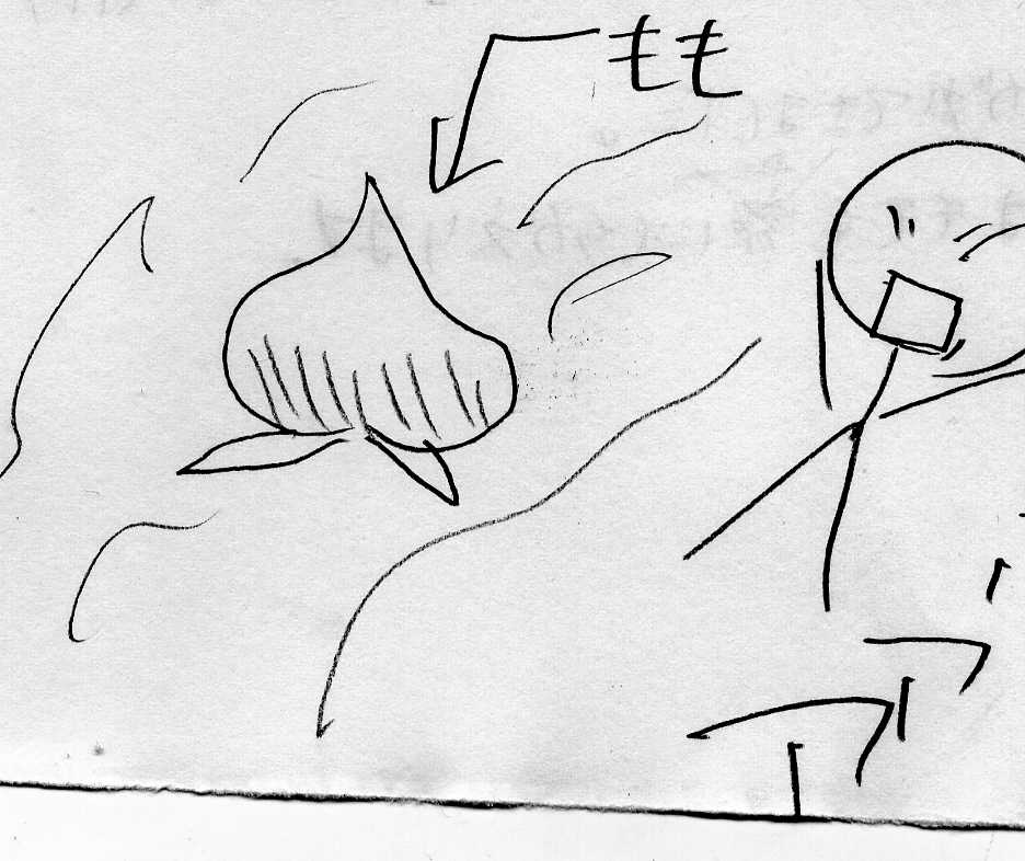 おばばが川で洗濯をしていると、桃が流れてきました。
